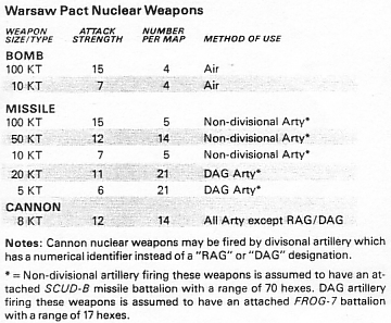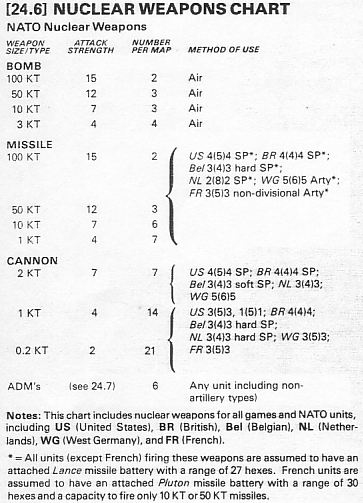 [24.4] NATO ASSIGNMENT OF NUCLEAR WEAPONS The NATO Player must plot nuclear weapon expenditure one Game-Turn in advance of actual employment. During the Nuclear Attack Segment, the NATO Player secretly writes down the identity number of a target hex or the designation of a target unit for each nuclear weapon he wishes to employ. He must also note the type of nuclear weapon used and the method by which it will be delivered (naming the specific artilery unit if the weapon will be fired by artillery). During the Nuclear Attack Segment of the next Game-Turn, the attacks of all nuclear weapons so assigned are resolved. If a Warsaw Pact unit is the assigned target of an attack, and the unit has been moved adjacent to a NATO unit or into a city hex, the attack is cancelled. Likewise, if the chosen delivery system is no longer available (i.e., the Warsaw Pact has air superiority or the assigned artillery unit is not within range), the attack must be cancelled. [24.41] The NATO Player may not choose a hex that contains a West German city, or that is occupied by, or adjacent to, a NATO unit as a target hex. [24.42] A cancellation of a nuclear attack is considered an expenditure, and the assigned nuclear weapon is no longer available. [24.43] The NATO Player may plot as many nucle ar attacks as he wishes in a single Game-Turn, up to the limit of weapons provided by his Nuclear Weapons Chart. [24.5] WARSAW PACT ASSIGNMENT OF NUCLEAR WEAPONS Nuclear attacks conducted by the Warsaw Pact Player are resolved in the same Nuclear Attack Segment in which they are declared. Each nuclear attack is declared against a specific target hex containing any number of NATO units (see 24.22). As long as a target hex is not adajacent to Warsaw Pact units, any hex may be chosen as a target. The Warsaw Pact Player must adhere to a rigid schedule of nuclear weapon expenditure. In the first Nuclear Attack Segment that the Warsaw Pact Player conducts nuclear warfare, he may ex pend up to 33 nuclear weapons. In each of the next six Nuclear Attack Segments that follow, he may expend up to 6 nuclear weapons. At the end of this period, the Warsaw Pact Player may expend a maximum of 3 nuclear weapons per Game-Turn for the duration of the game. The limits on expenditure given above are maximums; the Warsaw Pact Player is free to expend fewer than allowed but doing so does not allow him to expend more in subsequent Game-Turns. [24.6] NUCLEAR WEAPONS CHARTS
