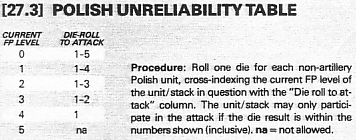 [25.2] PROPERTIES OF STATIC BATTALIONS Each static infantry battalion is treated as a soft unit possessing an Attack Strength of "0" and a Defense Strength of "1". Static battalions may neither move, attack, nor expend Operation Points in any manner. Static battalions may never retreat; they must absorb all adverse combat results by gaining FP's. [25.21] NATO units of any nationality may be stacked in a hex occupied by a static battalion. The static infantry unit does not count for purposes of stacking, although it may add its Defense Strength to that of any units stacked with it. [25.22] If units which are stacked with a static battalion are retreated as a result of combat, the static battalion is automatically eliminated. [25.23] Static infantry battalions may never participate in an attack nor contribute toward the application of column shifts when resolving a NATO attack. [25.24] The current FP level of each static infantry battalion is shown by placing the appropriate FP marker in the hex it is considered to occupy. The FP level of a static battalion is never averaged with other units occupying the same hex. Each static battalion may possess from 0 to 4 FP's; when such a unit is called upon to gain a fifth FP, it is eliminated. Remove the FP marker from play. [25.3] AVAILABILITY OF STATIC BATTALIONS The following static battalions are available for use in the first three games of the series, and must be placed within the limits of the cities listed: BAOR: VBK 22 (Hannover), VBK 23 (Hildesheim), VBK 35 (Detmold), VBK 44 (Kassel). Fifth Corps: VBK 41 (Koblenz), VBK 43 (Wiesbaden). Hof Gap: VBK 63 (Ansbach), VBK 64 (Wurzburg), VBK 67 (Bayreuth). [26.0] WEST GERMAN DOCTRINE COMMENTARY: Current West German tactical thought is heavily influenced by the political concept of "forward defense." With the advent of this doctrine, traditional German excellence in mobile defense has been sacrificed to the idea of holding as much ground, as far forward, as possible. GENERAL RULE: No West German unit may retreat to fulfill combat loss requirements until it is within 2 FP's of being destroyed. Therefore, a West German mechanized or armored battalion could not retreat until it had a cumulative total of 3 FP's. Similarly, a West German company, could not retreat until it had absorbed at least 2 FP's, and an artillery unit could not retreat unit] it had accumulated 4 FP's (except when being attacked by counter battery fire only). [27.0] POLISH UNRELIABILITY COMMENTARY: Polish forces are among the best trained and equipped units in the Warsaw Pact. While they would undoubtedly be very tenacious in the defense of their homeland, their enthusiam for a Soviet war of aggression might be of a low order. CASES: [27.1] COMBAT LOSSES To simulate deteriorating morale, double all combat losses against Polish units from the Combat Results Table. [27.2] DETERMINING UNRELIABILITY All Polish non-artillery units participating in attacks are subject to unreliability. For each such unit or stack, the Warsaw Pact Player must roll one die on the Polish Unreliabilty Table (27.3) at the time he declares combat. Based on the number of FP's the unit/stack in question currently possesses, the Table will yield a result which either allows or denies the unit the ability to participate in the attack. This procedure is initiated separately for each stack for each attack throughout the game. [27.3] POLISH UNRELIABILITY TABLE