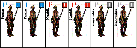 Here are a few new leaders to add to Wilderness War. Wilderness War Native Leaders: Three Native leaders are featured in this variant, Pontiac of the Ottawa, King Hendrik of the Mohawk, and the Seneca war leader Sangerachta. In general, Native leaders may command any combination of Indian and auxiliary units, as long as the number of non-Indian units does not exceed the number of Indian units. As well, a Native leader may accompany one individually activated Indian unit at no additional activation cost (and thus may use his Tactics rating when raiding). Specific considerations follow. Pontiac: Activation: 1, Command: 4, Tactics: 1 He rose to become one of the most important leaders of the Ottawa nation. With an Ojibwa mother, however, his influence spread beyond his own tribal affiliation. He was a staunch French ally, and after the French defeat in 1763, he attempted to carry on the war against Anglo-American expansion into the Ohio valley on his own with a coalition of nations, especially the Shawnee and Ottawa. Pontiac can command any French allied Indian units, plus any coureurs as limited by the restrictions above (for example, Pontiac could command any four French allied Indians, three Indians and one coureurs, two Indians and one or two coureurs, one Indian and one coureurs, or one Indian). He begins the 1757 Scenarios in Logstown. In the 1755 scenarios Pontiac begins in Ohio Forks. King Hendrik: Activation: 1, Command: 2, Tactics: 1 The staunchest British ally among the Six Nations, Hendrik was called a "king" as a sign of respect (although the concept of kingship was quite foreign to the Iroquois league). Hendrik was killed in 1755 during the attack on Crown Point. Hendrik can command only the two Mohawk Indian units, or one Mohawk and one ranger (or of course, just one Mohawk). Hendrik is used only in 1755 scenarios, and begins in Albany. Sangerachta: Activation: 1, Command: 5, Tactics: 1 In times of major crisis, the Six Nations would elect two war leaders, traditionally both from the Seneca nation. Sangerachta, an imposing figure standing well over 6 feet tall, was the most respected war leader, and would lead the Six Nations in both this war and the American Revolution. He can command up to five Iroquois Indian units, including both grey and red Mohawk units, or a mixture of Indian and Ranger units subject to the restrictions above if British allied; or if French allied, he can command a combination of five grey Iroquois units and the Caughnawaga unit, or a combination of these Indian units and coureurs subject to the restrictions above. Sangerachta enters the game when the Iroquois Alliance card is used as an event.![]()