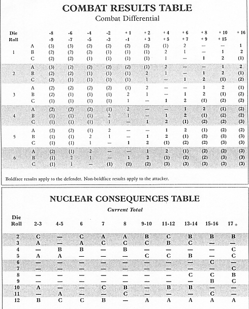 SUPERPOWERS AT WAR Game Errata and Charts The following errata corrects set-up, air points, and victory conditions in the game. Use the corrected Combat Results Table and Nuclear Consequences Table to play the game. Across the Rhine Scenario The Belgian Limburg Provincial Rgt. (3 units) enters on game turn 1 on Genk Road (hex 1502). EX [12.0] The available air points can be used once per turn. EX [21.01 VICTORY CONDITIONS: The victory point conditions should be corrected. Replace the NATO player sixth through tenth VP conditions with the following: 3 VP per urban or city hex destroyed by a Soviet nuclear weapon or firestorm. The Warsaw Pact Player earns victory points for the following: 1 VP per NATO unit eliminated or in the replacement pool at the end of the game. 1 VP per Warsaw Pact unit exited from the western map edge to which a supply line can be traced at the end of the game. 1 VP per in-supply unit west of the Maas River at the end of the game. 5 VP per non-destroyed city hex occupied by Warsaw Pact forces at the end of the game. 6 VP per urban or city hex destroyed by a NATO nuclear weapon or firestorm. The Warsaw Pact garrison rules given in the Drive on Munich Scenario victory conditions also apply to the Across the Rhine Scenario rules.