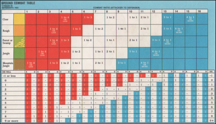 Both Ground and Air combat are very basic affairs, and the respective combat tables are not particularly bloody. This may be a conscious